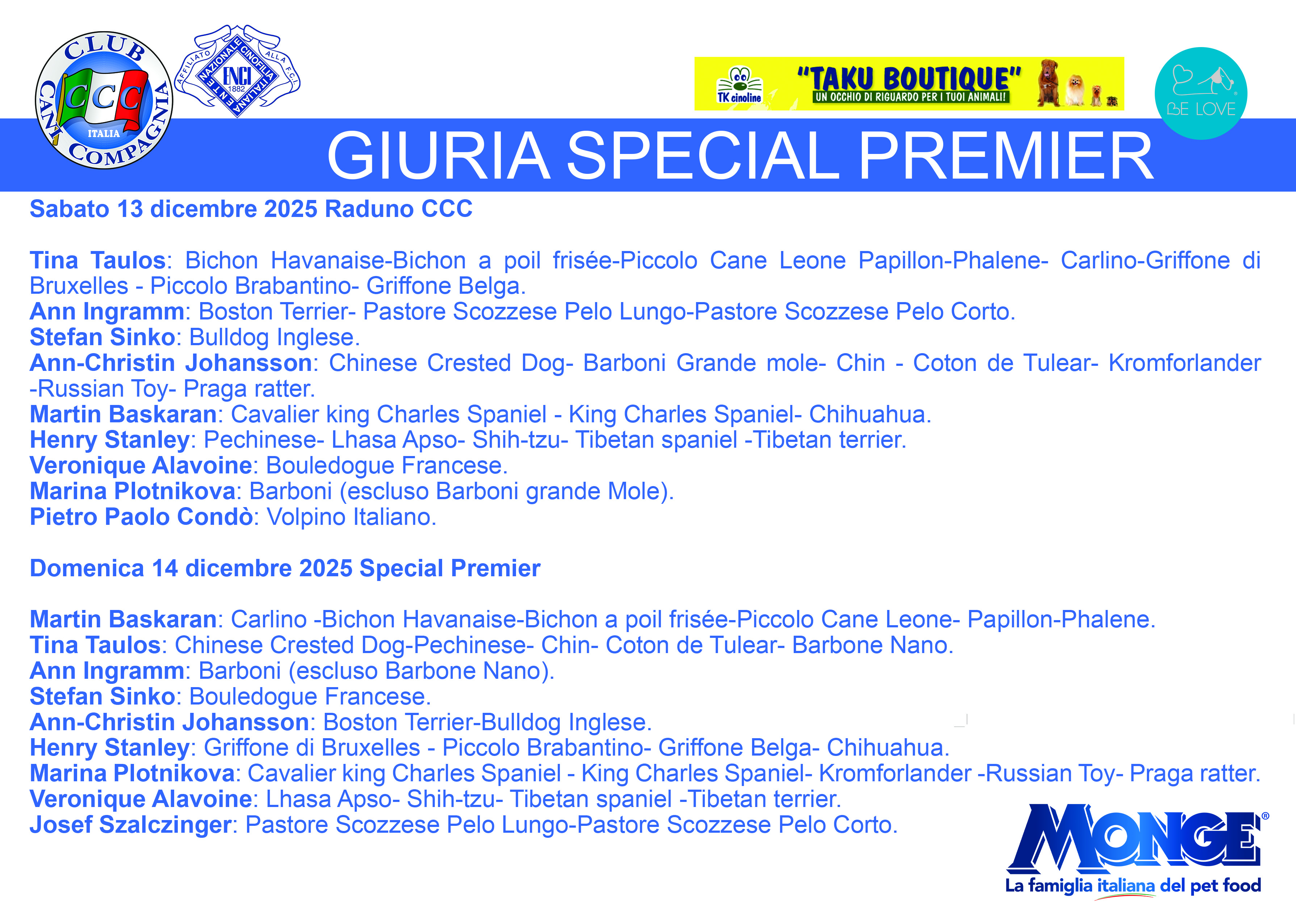 un sincero grazie a tutti voi per l’entusiasmo e la grande partecipazione che state dimostrando verso l’evento CCC di Montesilvano! Siamo davvero felici di vedervi così numerosi. Al termine delle Mostre Speciali del Club Cani Compagnia, verrà offerto ai Soci un piacevole aperitivo proprio vicino ai quattro ring allestiti per l’occasione: sarà un bel momento per salutarci, chiacchierare e condividere l’emozione della giornata insieme. Nel frattempo, fervono i preparativi sia per le Mostre Speciali che per il Raduno di Sassari, in programma per l’11 e il 12 ottobre, senza dimenticare l’appuntamento di Bergamo il 17 ottobre. In allegato trovate le giurie dei raduni previsti per il 13 e 14 dicembre, Raduno CCC e Special Premier, una richiesta di adesione che molti di voi hanno espresso e che siamo lieti di soddisfare. Siccome come già annunciato, con noi svolgeranno i loro Raduni anche le Associazioni Specializzate: Club Italiano Bulldog - Società Italiana Collie e Associazione Tecnica Amatori Volpino Italiano, troverete per sequenza ed organizzazione dei ring, anche le loro giurie, saremo un bello squadrone! Cogliamo anche l’occasione per ricordarvi gli eventi collaterali, come la Cena dei Soci: abbiamo ricevuto tantissime adesioni e la serata si preannuncia davvero speciale! Presto con annuncio a sé stante verranno divulgate le informazioni utili alla prenotazione e man mano le altre iniziative. Vi mandiamo un caro saluto e vi aspettiamo con gioia ai prossimi incontri: portate con voi il vostro entusiasmo e la vostra passione per rendere ogni evento ancora più indimenticabile. Con affetto, Pietro Paolo Condò Presidente CCC ed il Consiglio Direttivo